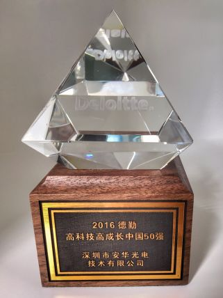 2016年11月16日,2016德勤 “高科技高成長中國50強” 頒獎典禮在武漢舉行。安華光電以行業(yè)收入增速三年累計1494%,接近15倍的增長率排名亞太區(qū)第二十七,中國第十三,深圳第一。